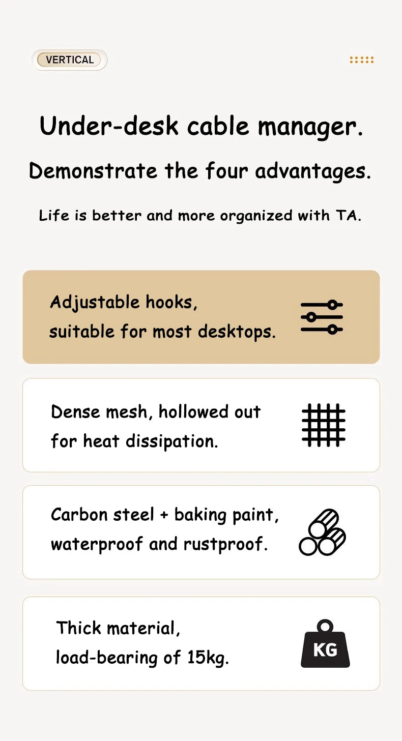 Gone are the days of messy cords tangling under your desk! ๐ฉ With this metal wire organizer, you can neatly store power strips, chargers, USB cables, and even small gadgets, keeping your workspace tidy, safe, and stylish. Its telescopic design ensures a perfect fit for desks of all sizes, whether at home or in a corporate environment.